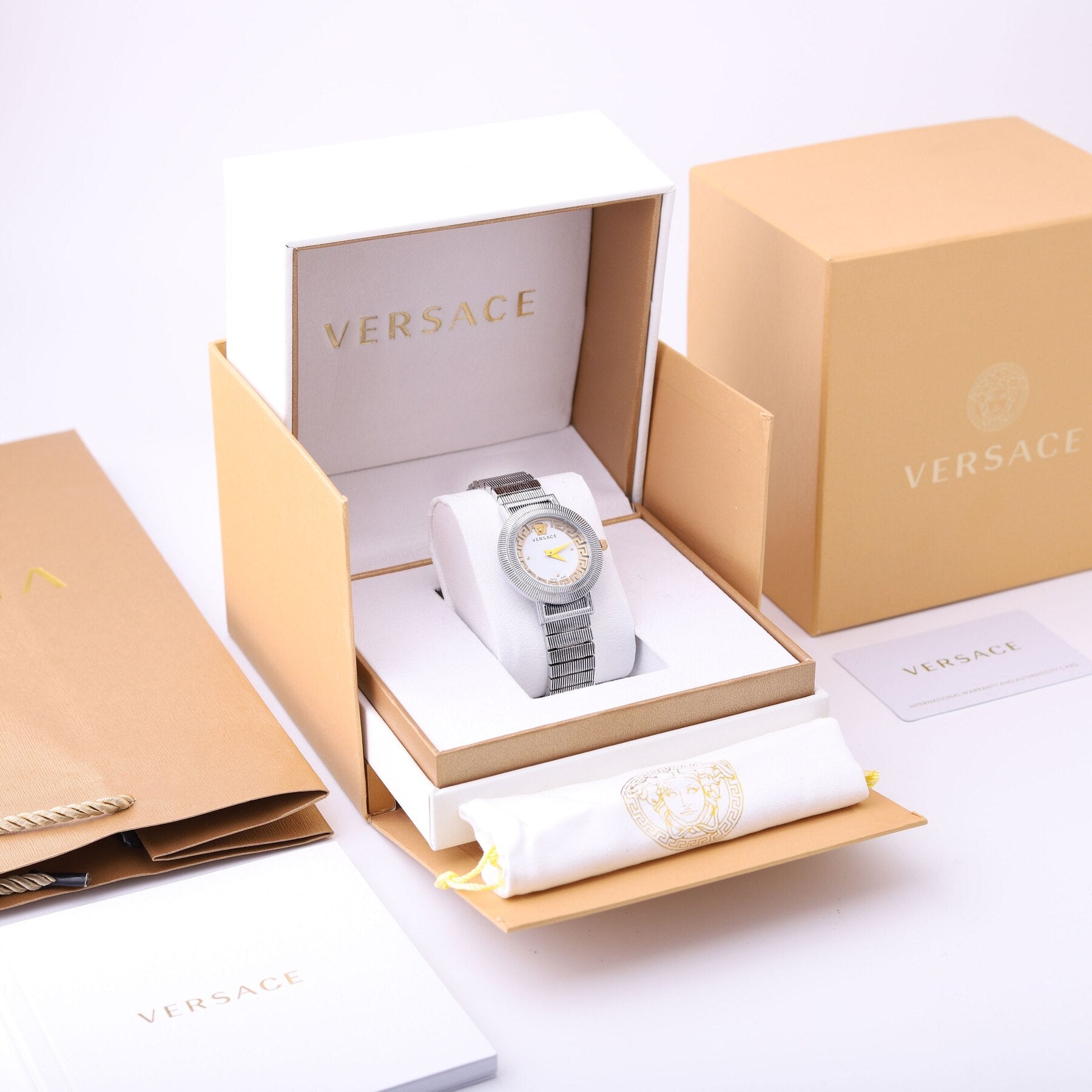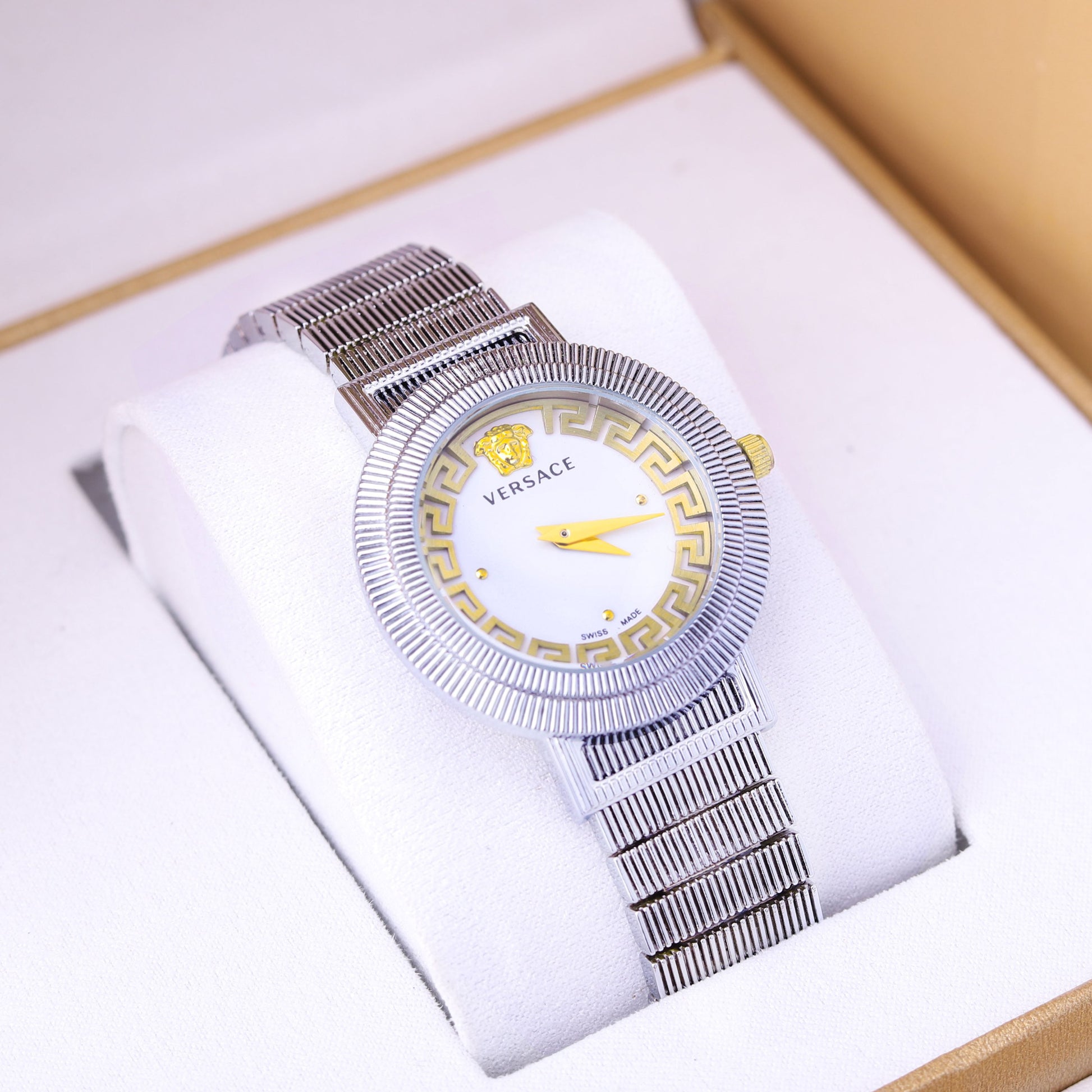 التفاصيل الأيقونية: يتميز الإطار (Bezel) أو جوانب الهيكل بنقوش الغريكا (Greca) المعمارية، التي تُضيف لمسة تراثية مميزة للدار.