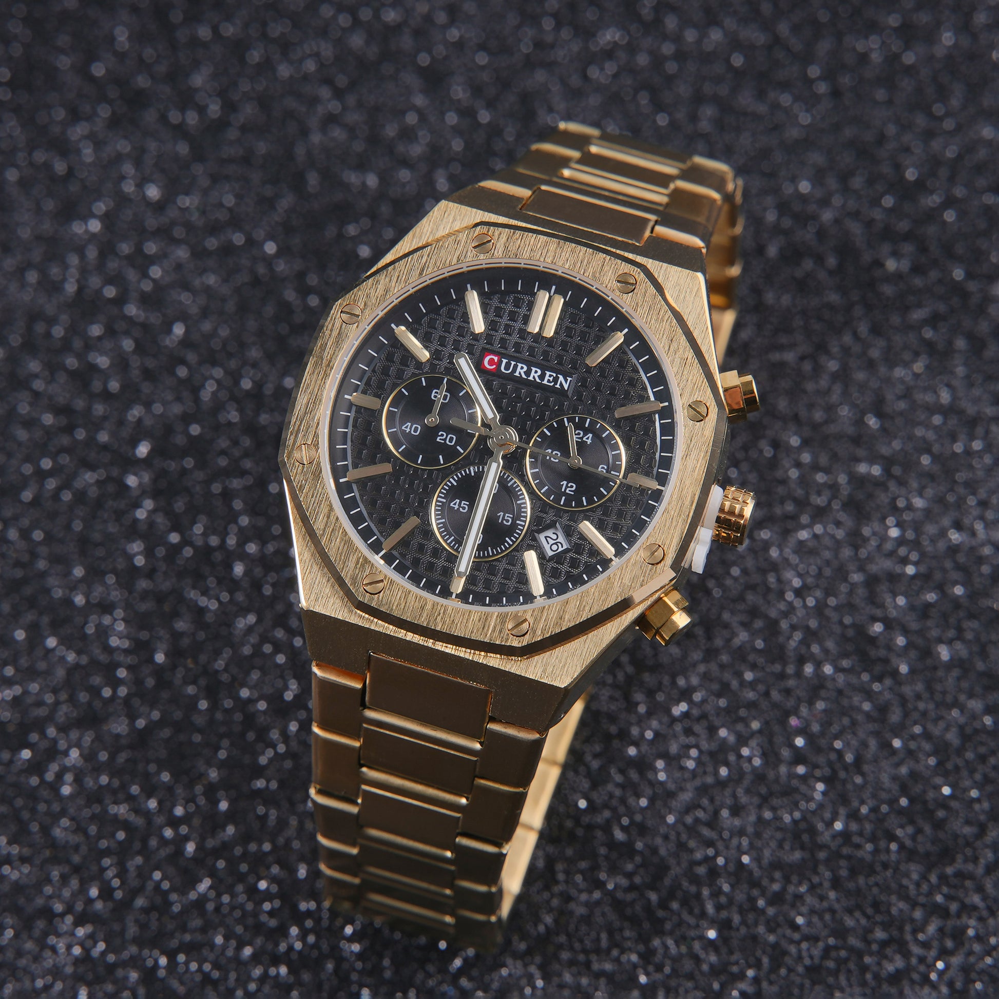 تجسد ساعة Curren Gold-Black Elite قمة الأناقة الثنائية. الميناء الأسود الداكن يبرز بحدة داخل الإطار والتفاصيل الذهبية اللامعة، مما يخلق تبايناً بصرياً قوياً وملفتاً للنظر. هذا المزيج مثالي للرجل الذي يريد أن يعبر عن ثقته ونجاحه، وهي الخيار الأمثل للمناسبات التي تتطلب تألقاً لا ينسى.