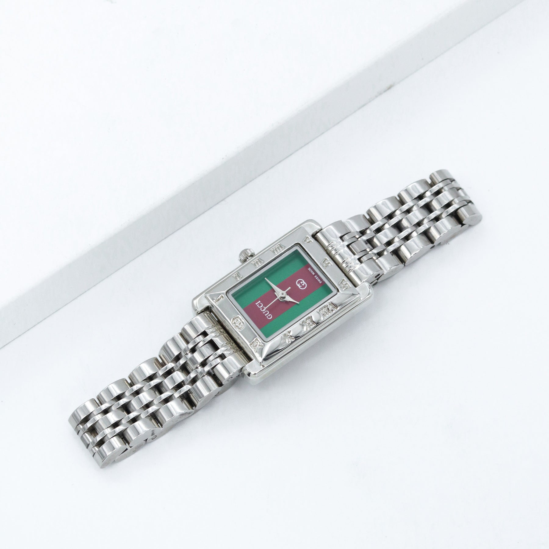 ساعة GUCCI – فضي مع لمسات أخضر وأحمر ⌚💚❤️