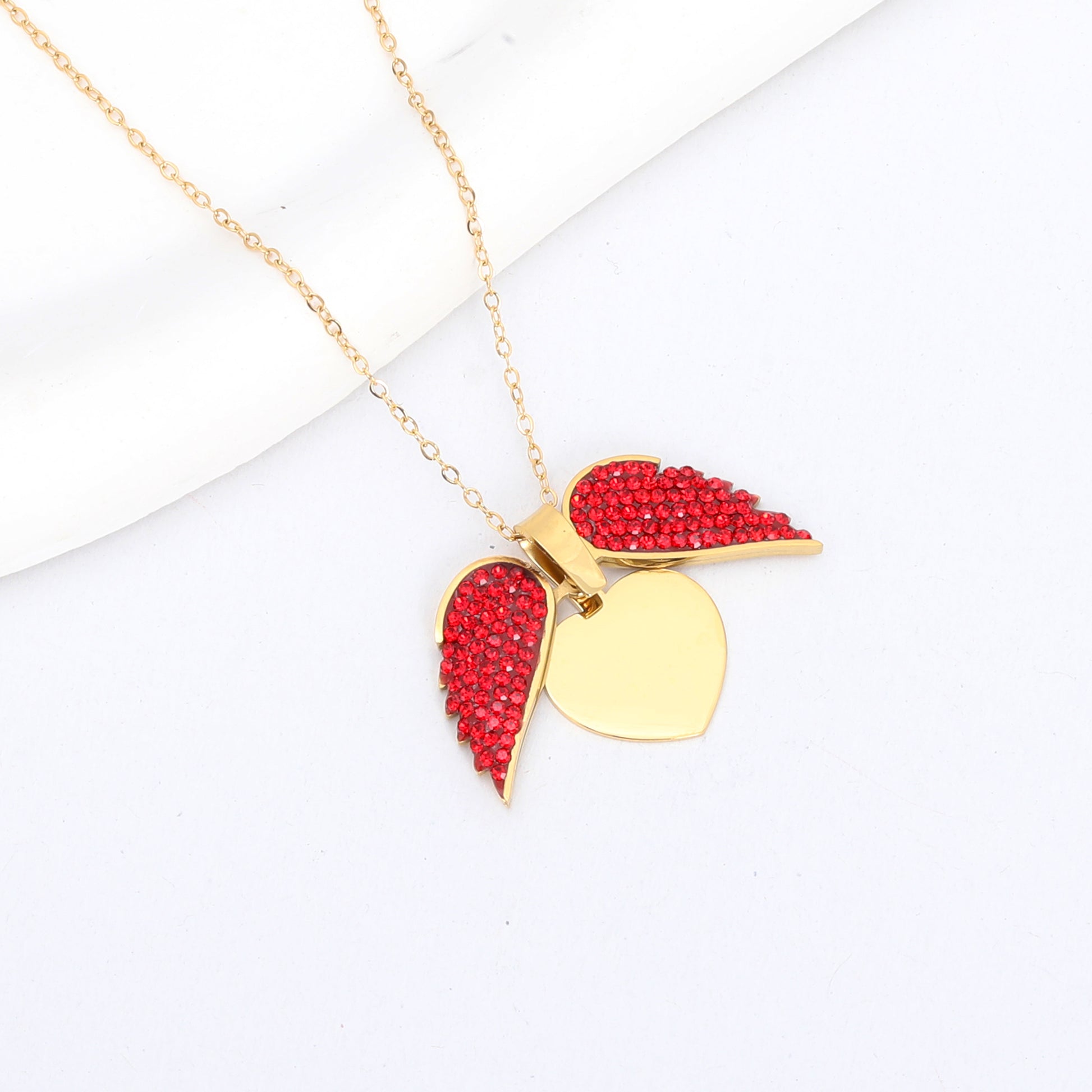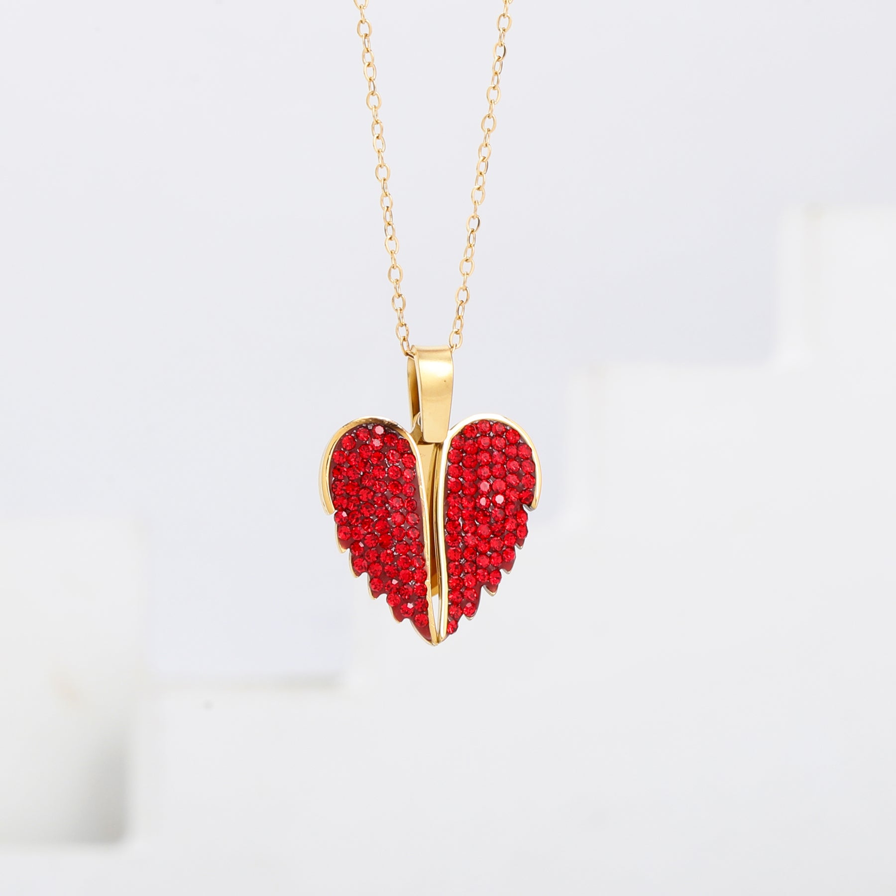 سنسال مطلي/معدن عالي الجودة – قلب مزين بأجنحة وأحجار زركون حمراء