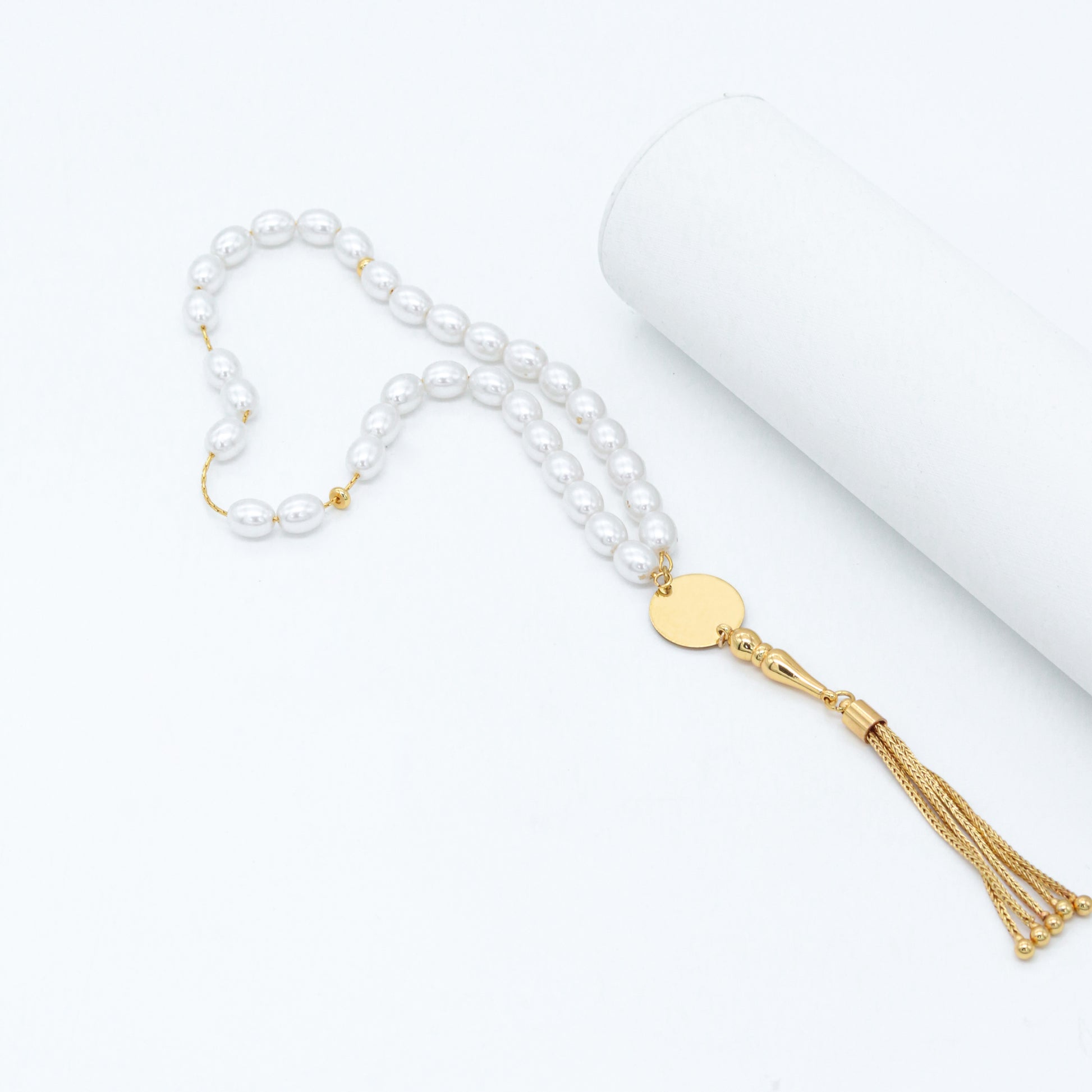 مسبحة لؤلؤ صناعي فاخر – تصميم مخصص مع حفر ذهبي فخم