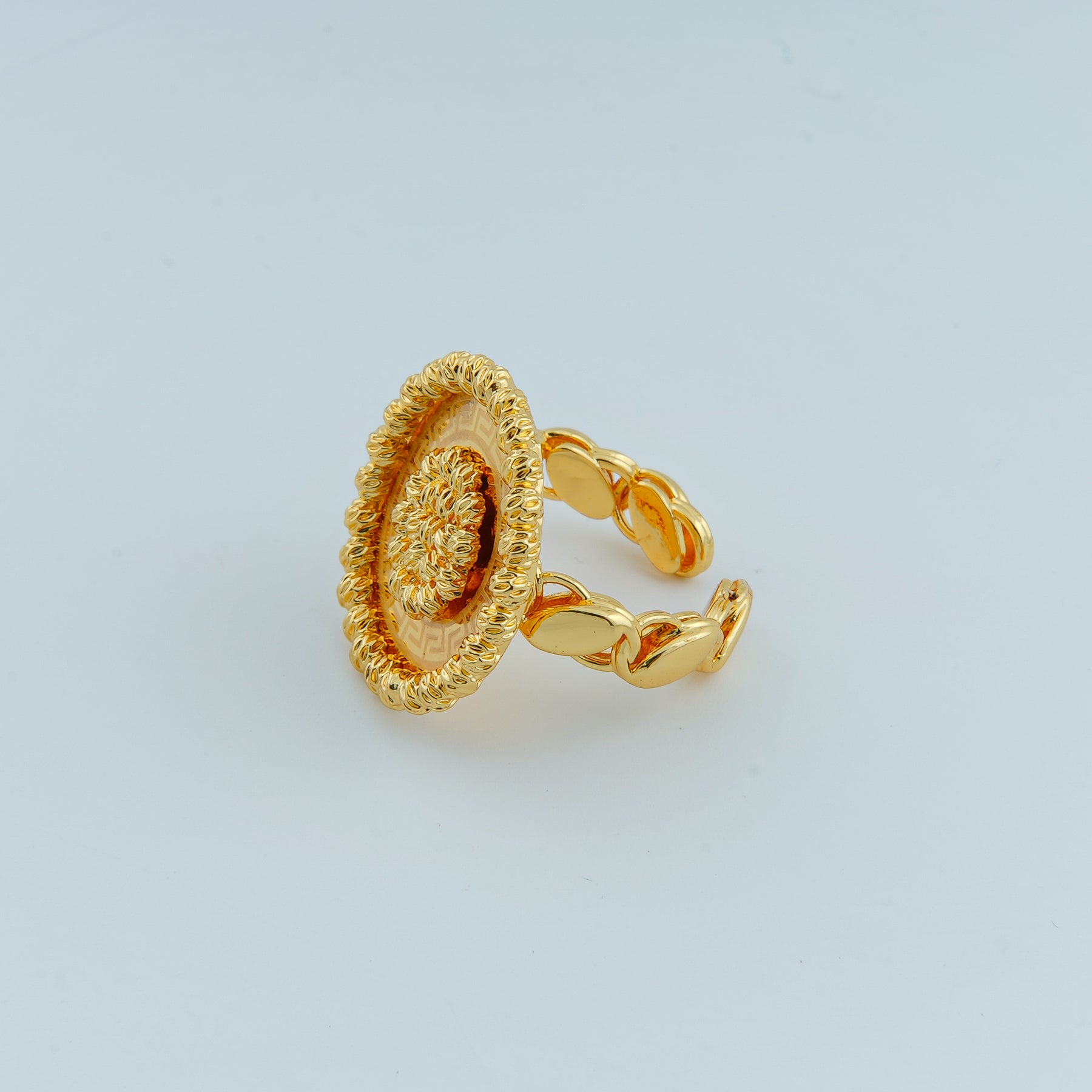 الزخرفة: يحمل على واجهته رأس ميدوسا المنقوش بعمق، مع تزيين جانبي الخاتم بنقش الغريكا، ليكون بمثابة تتويج ذهبي للأنامل.