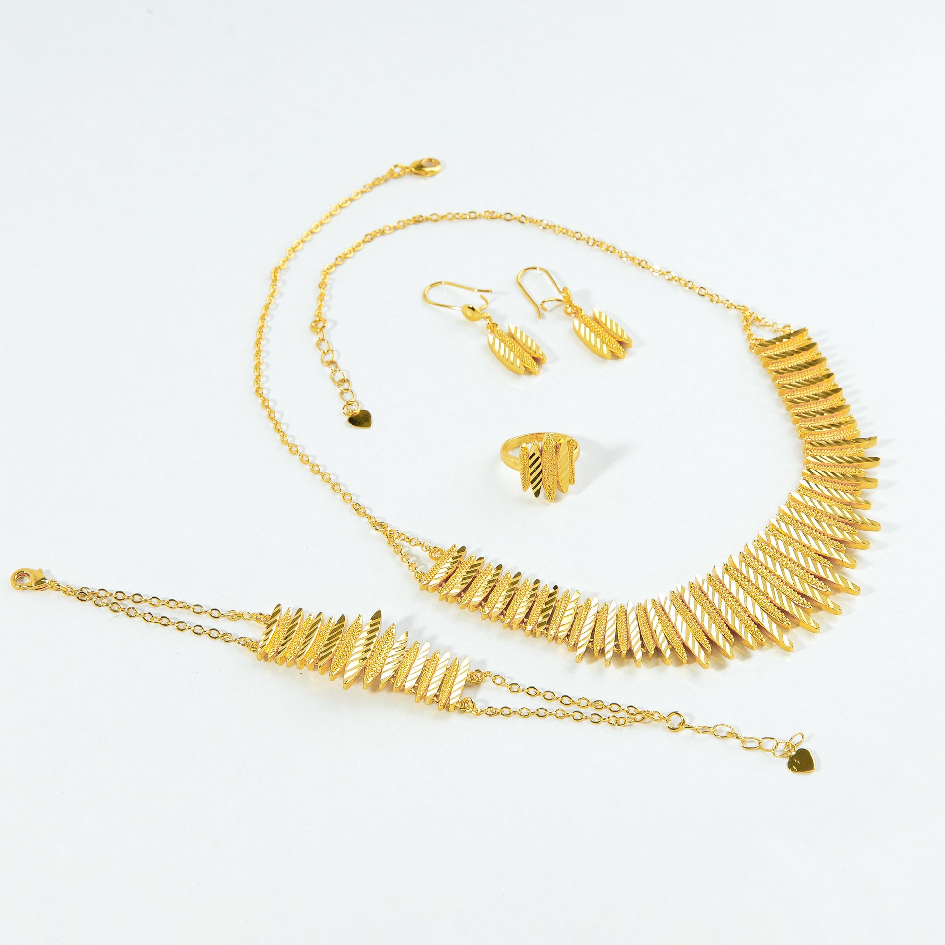 المعدن: غالباً ما يُصنع هذا الطقم من الذهب الأصفر عيار 21 قيراطاً ليعكس قوة وإشراق لون الشمس، أو من الذهب المطلي عالي الجودة.
