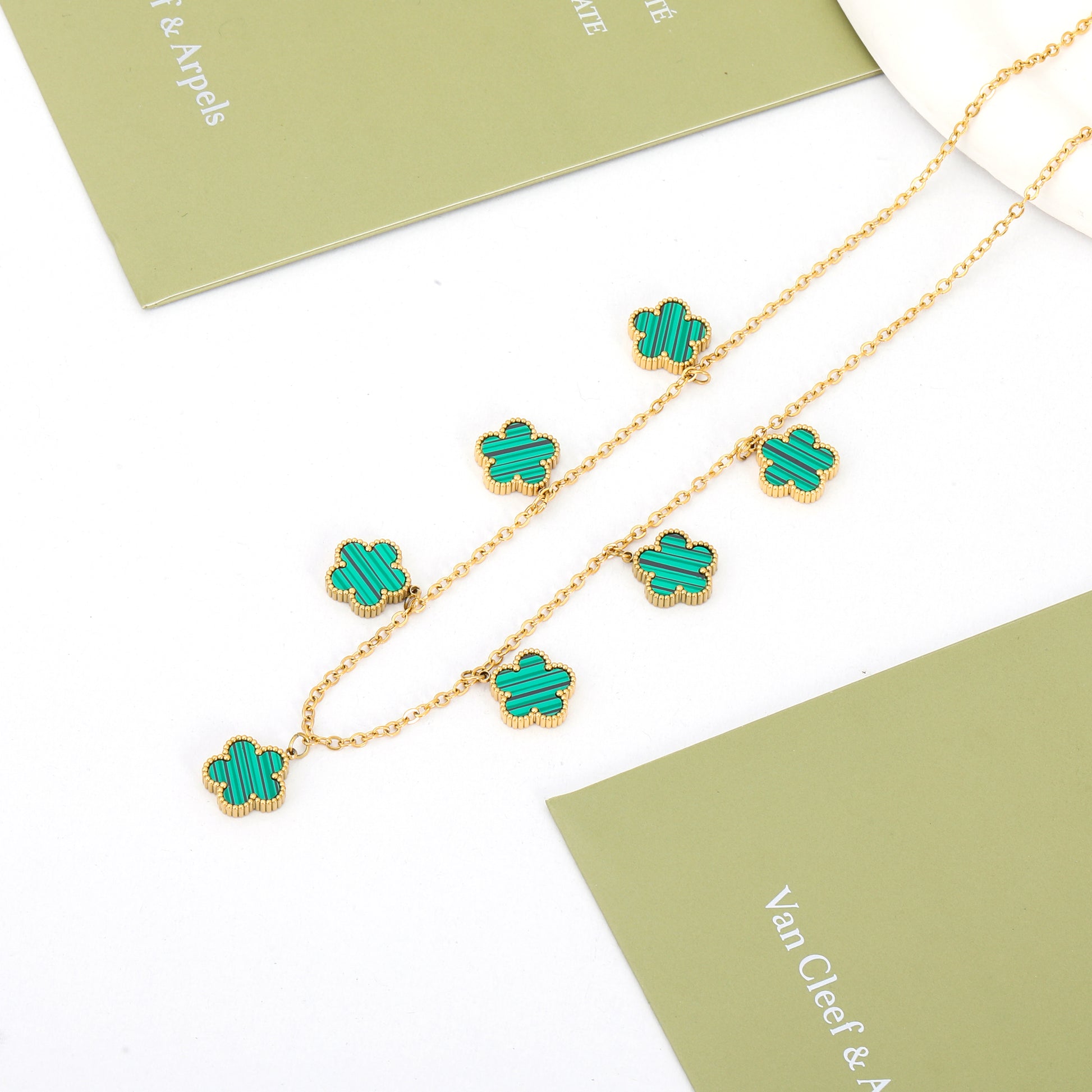 سنسال فان كليف الذهبي والأخضر يُجسّد روعة الطبيعة في أرقى تفاصيلها، حيث يلتقي بريق الذهب مع اخضرار الزمرد في تصميم ينبض بالحياة.