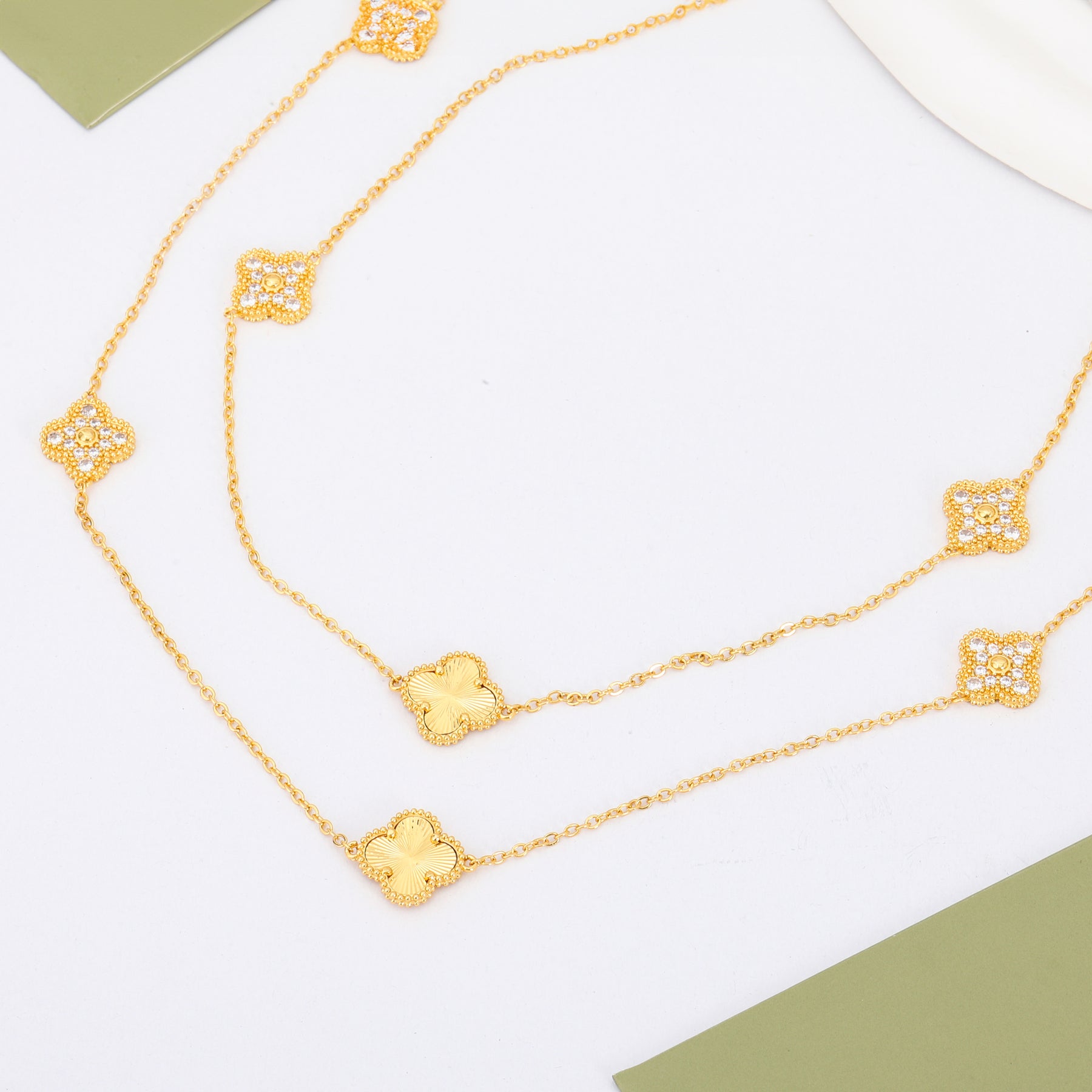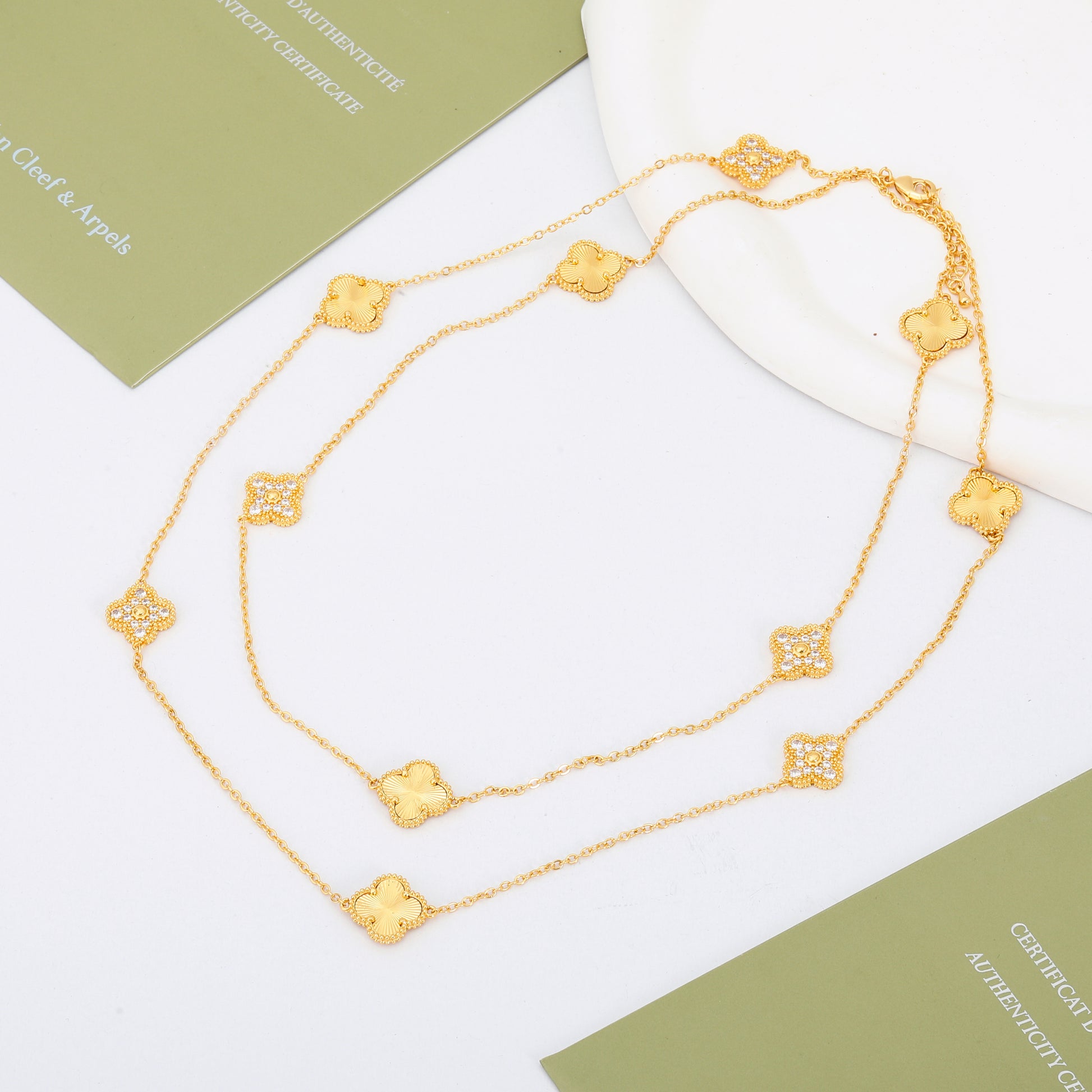 سنسال فان كليف الفاخر بطول 160 سم، يجمع بين فخامة الذهب وبريق الزركون في تصميم يخطف الأنظار. قطعَة استثنائية تمنحكِ إطلالة ملكية في كل مناسبة.
