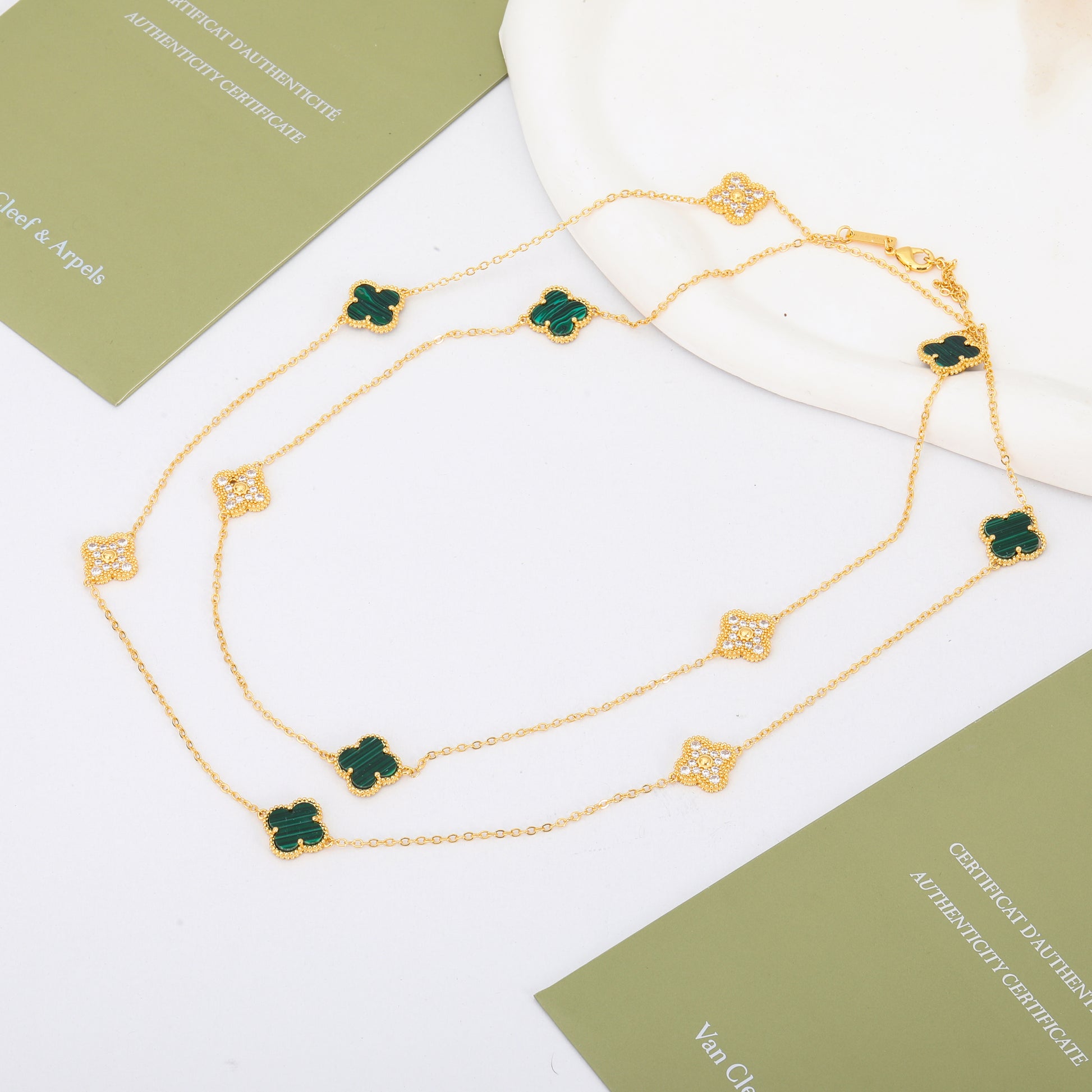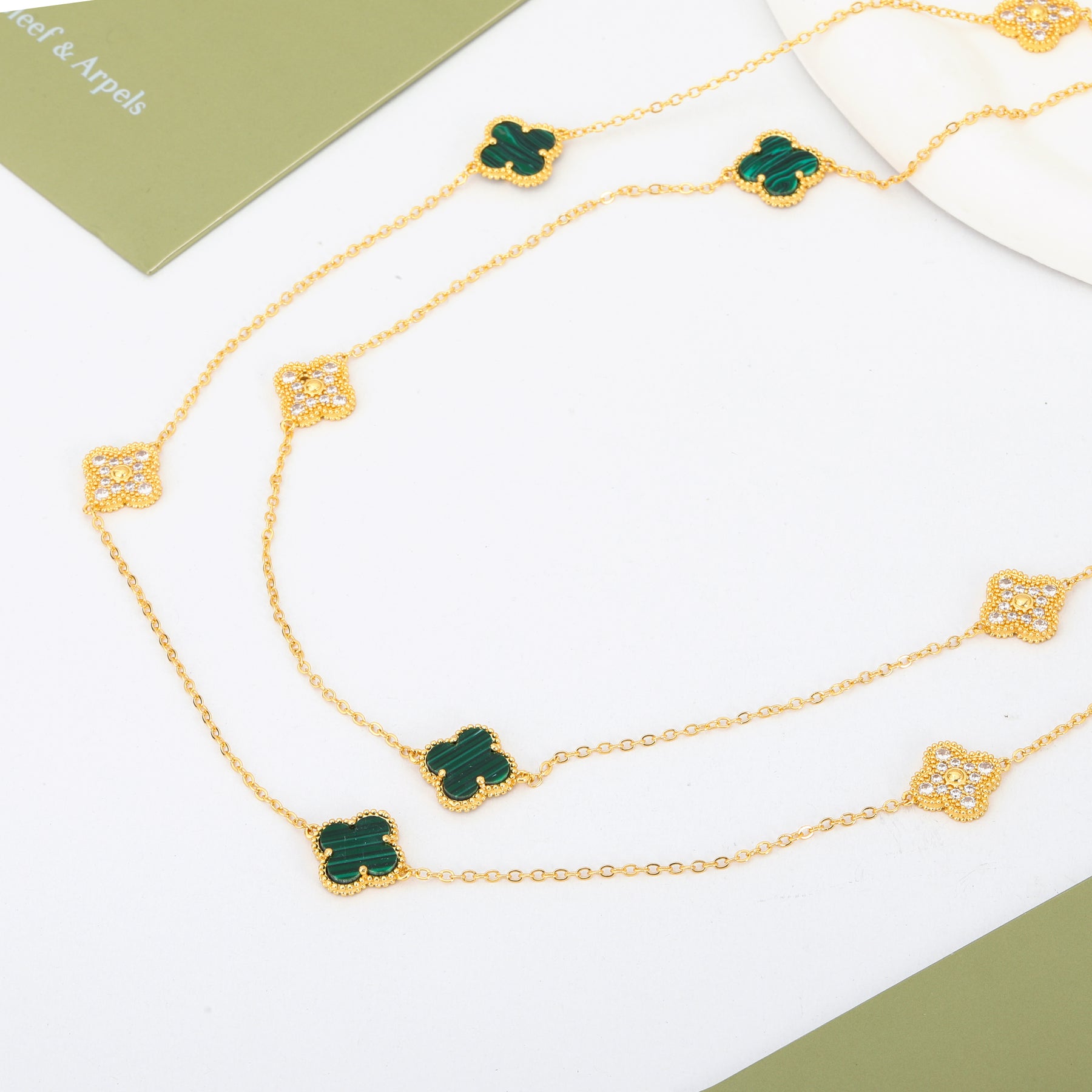 🌿 التصميم: سلسلة طويلة بنصف زركون بتصميم فان كليف الأيقوني
