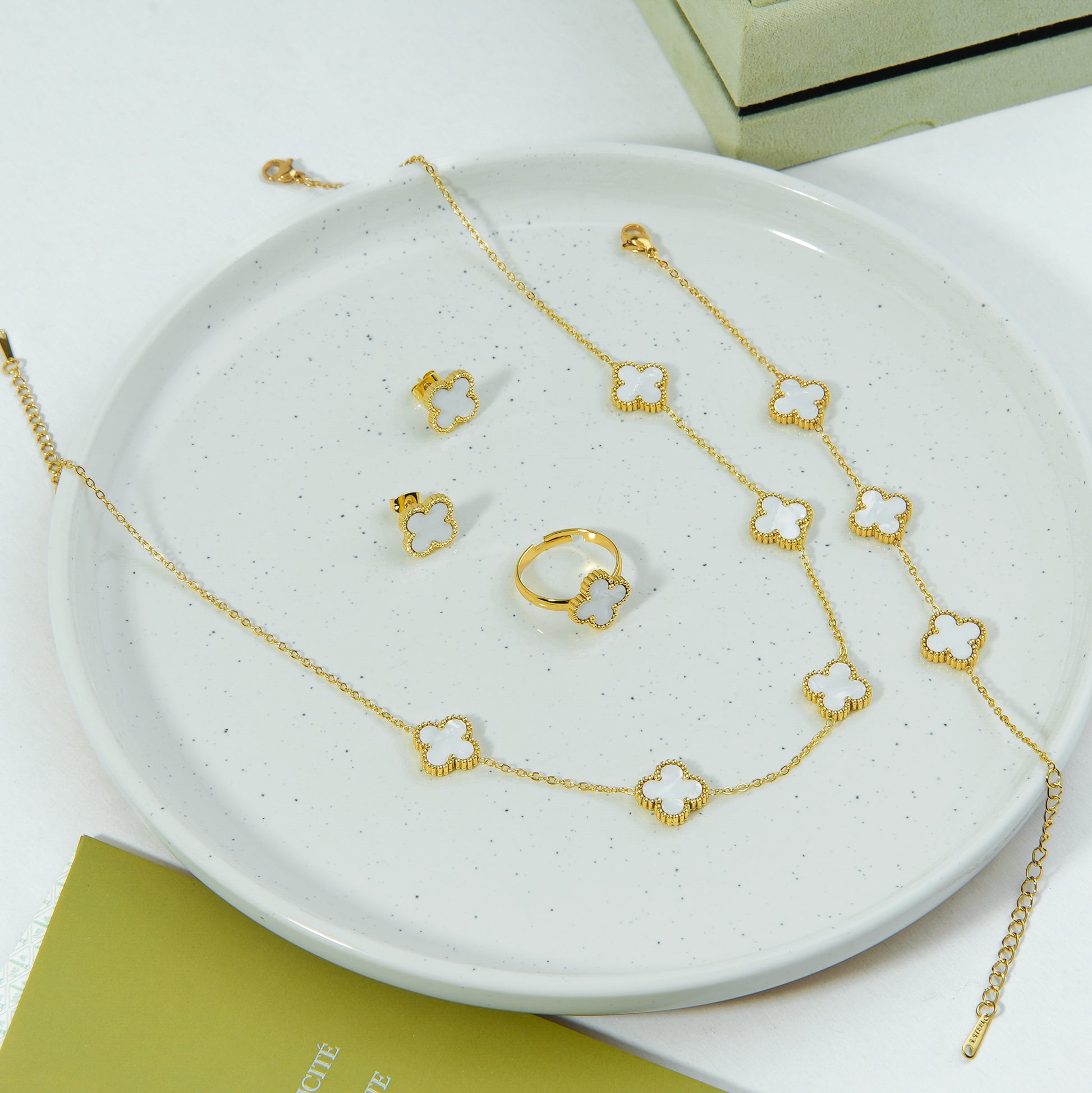 طقم فان كليف الأبيض يُقدم لكِ أربع قطع متناغمة تجمع بين النقاء والجمال. إطلالة بيضاء ناصعة تمنحكِ أناقة خالدة في كل مناسبة.