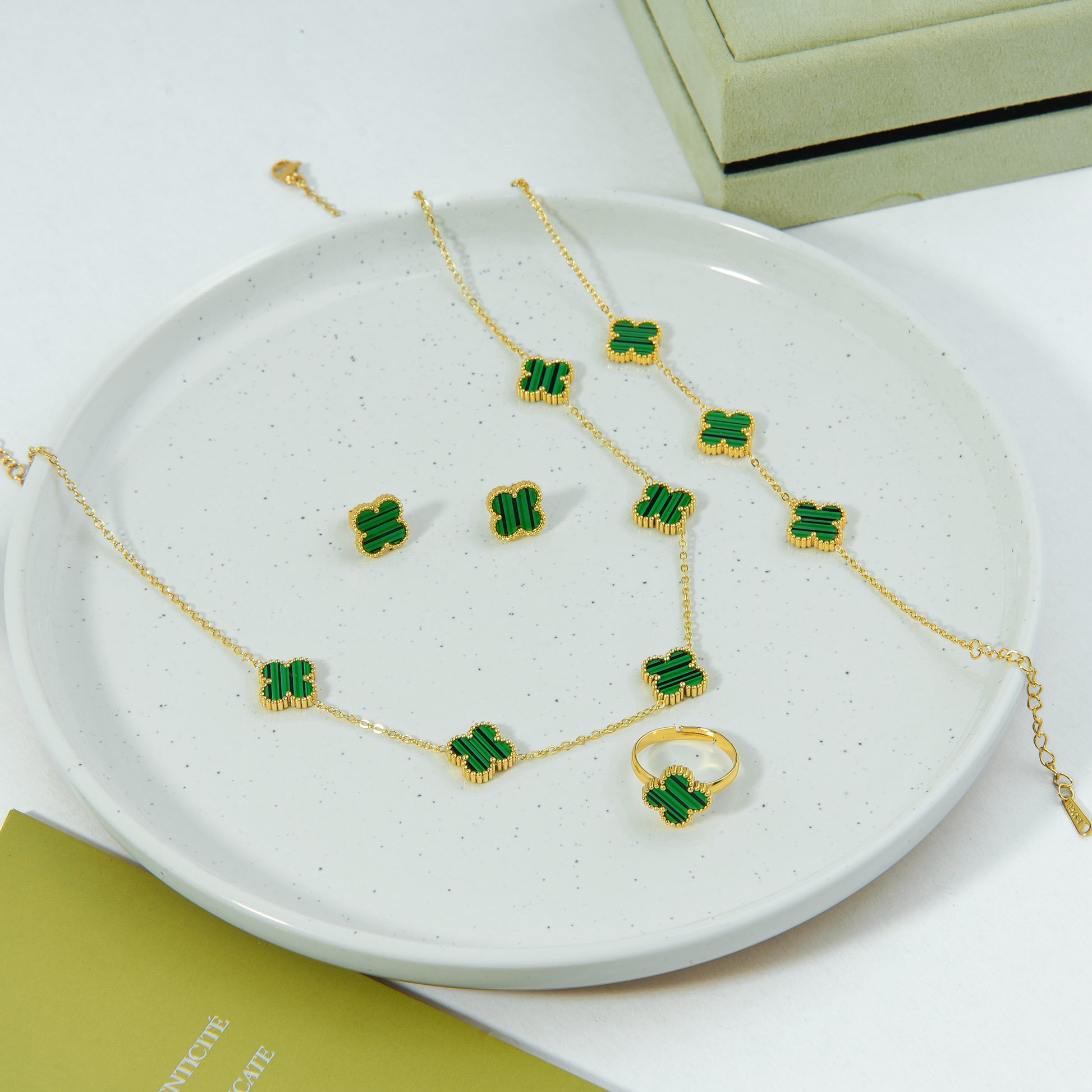 طقم فان كليف الأخضر يُقدم لكِ أربع قطع متناغمة تجمع بين جمال اللون الأخضر ومتانة الستانليس ستيل. إطلالة تنبض بالحيوية والأناقة في كل مناسبة.