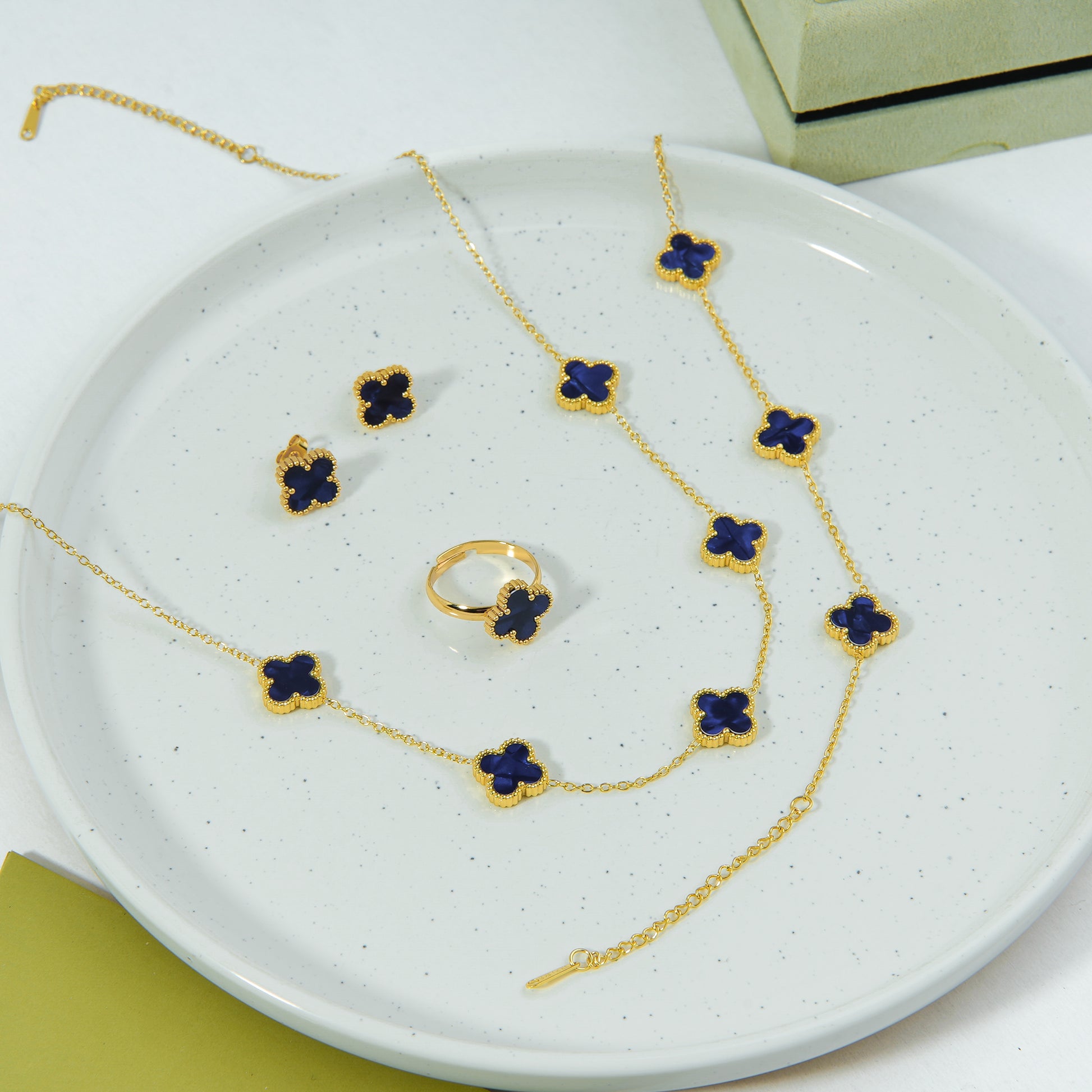 طقم فان كليف الأزرق يُقدم لكِ أربع قطع متناغمة تجمع بين عمق اللون الأزرق ومتانة الستانليس ستيل. إطلالة تنبض بالهدوء والأناقة في كل مناسبة.