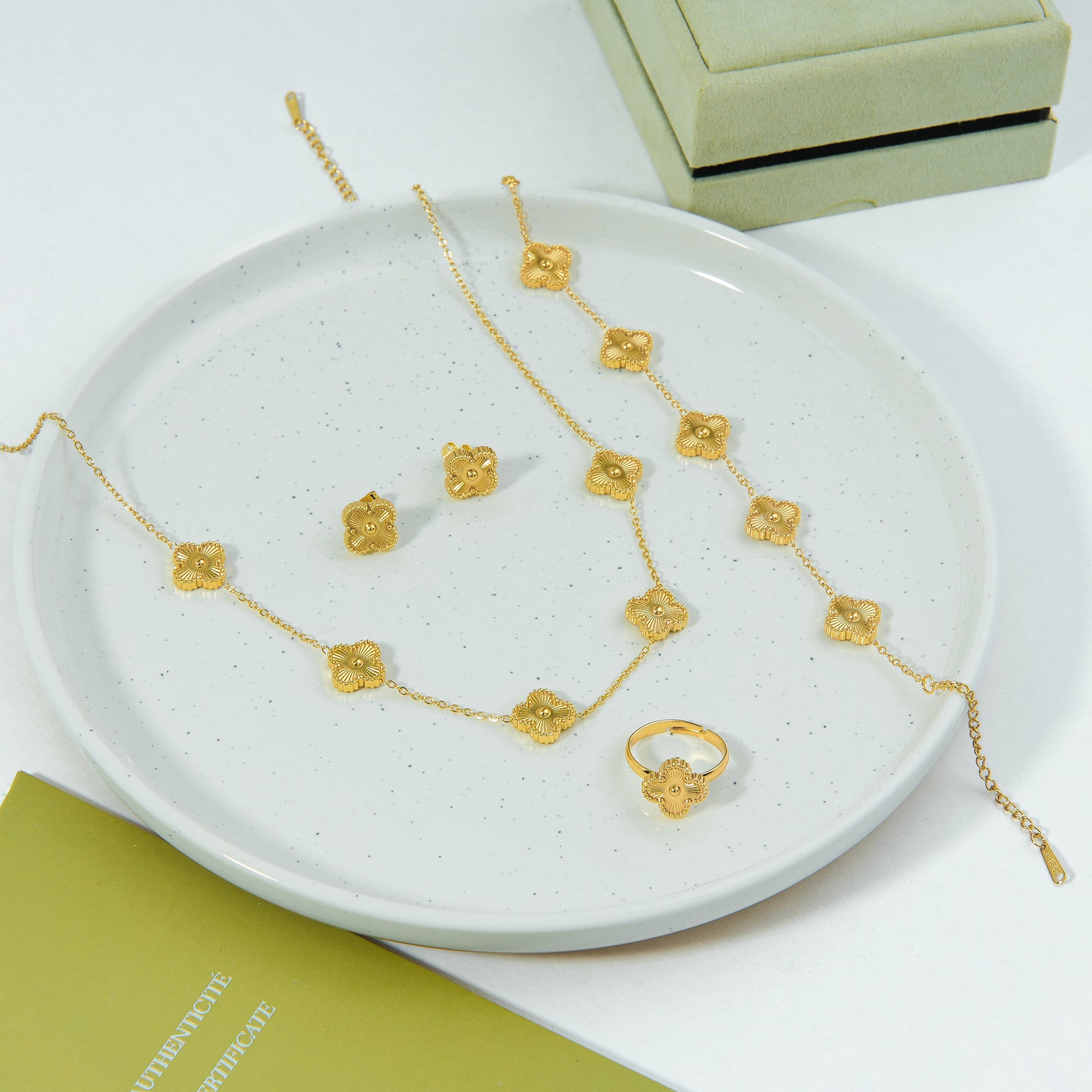 طقم فان كليف الذهبي يُقدم لكِ أربع قطع متناغمة تجمع بين الفخامة والمتانة. إطلالة ذهبية تمنحكِ أناقة لا تُضاهى في كل مناسبة.