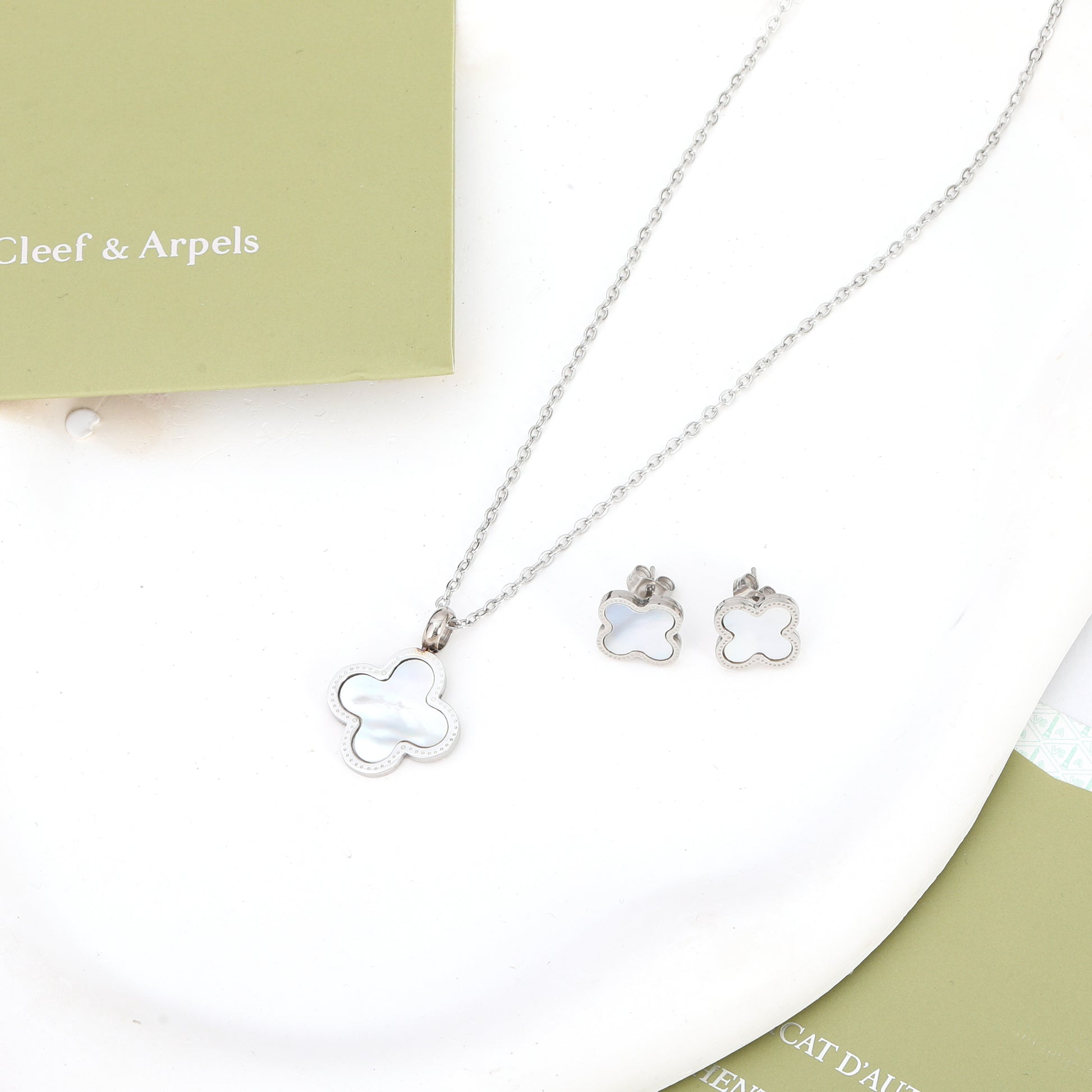✨ طقم فان كليف فضي وأبيض ناعم - سنسال وحلق ✨