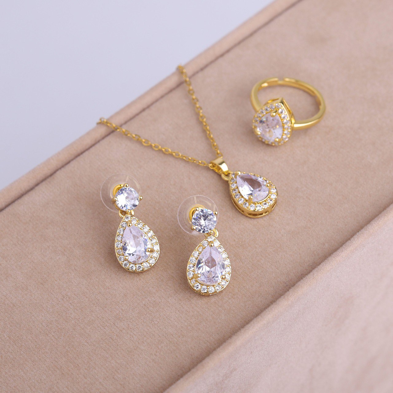 طقم لازوردي يتكون من 3 قطع بشكل دمعة باللون الذهبي مرصعة بزركون كامل، يمنحك إطلالة متألقة وفخمة في كل المناسبات ✨