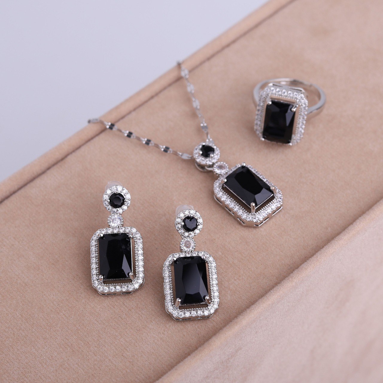 طقم لازوردي يتكون من 3 قطع باللون الفضي مرصعة بزركون أسود فاخر، يمنحك إطلالة أنيقة ومميزة في كل المناسبات ✨