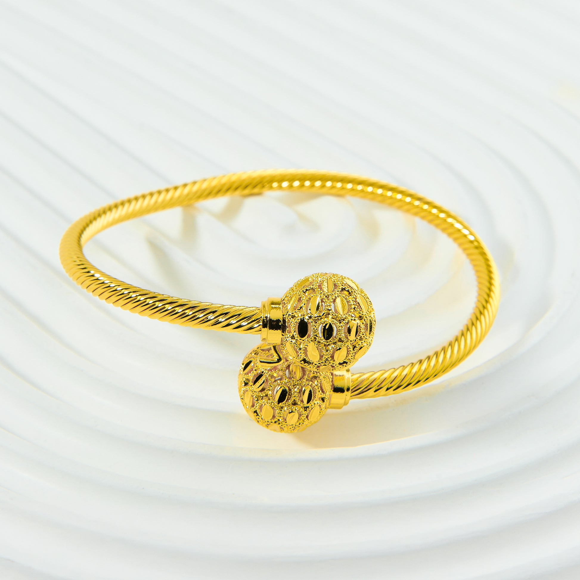 تُعتبر إسوارة البانجل (Bangle) التي تتميز بعنصري "الطابة" و "المجدل" قطعة مجوهرات كلاسيكية وحديثة في آن واحد، وغالباً ما تكون مصنوعة من الذهب الخالص (عيار 18 أو 21) أو من معادن عالية الجودة مطلية بالذهب.