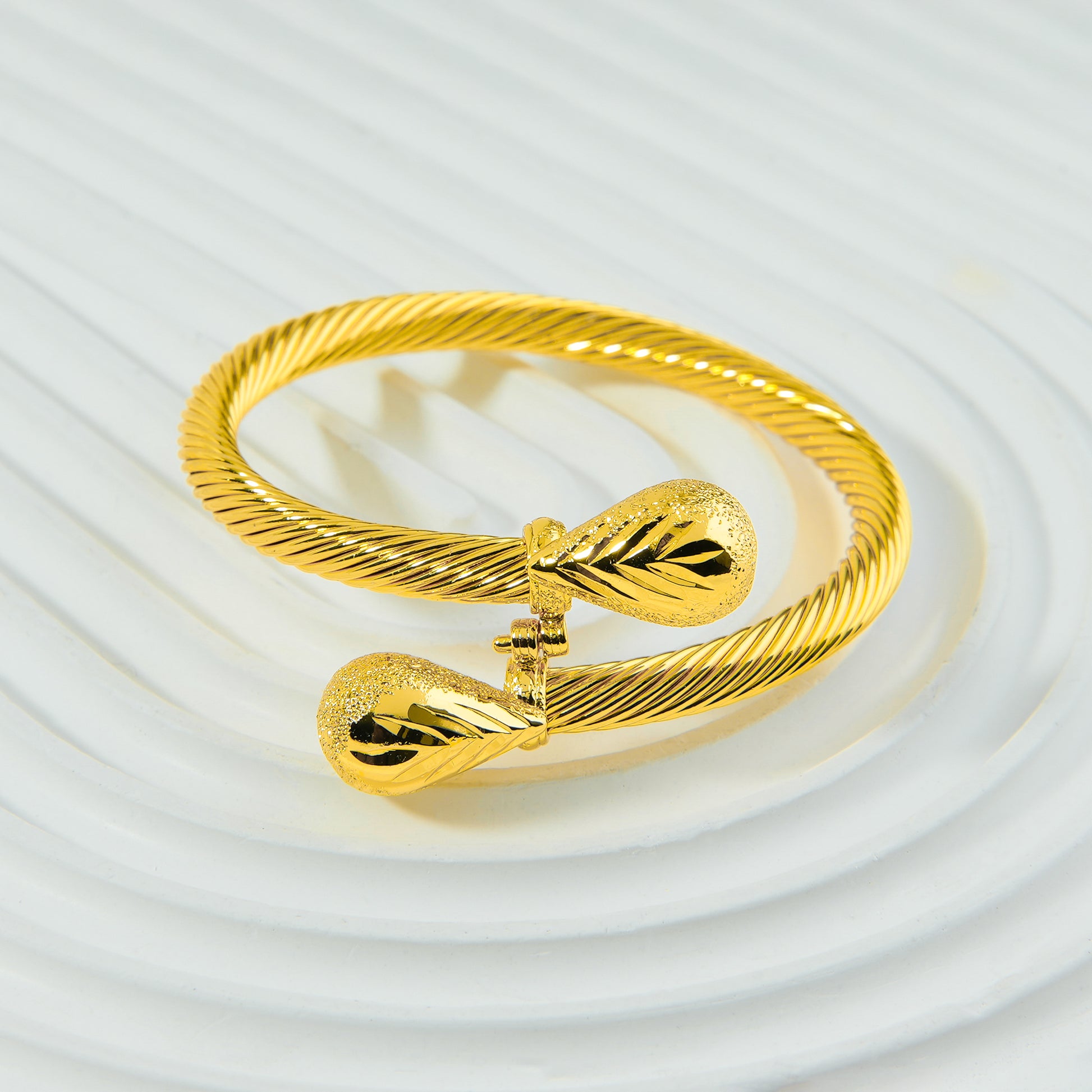 2. الزخرفة المجدولة (المُضفرة): يُشير مصطلح "مجدل" أو "مُضفر" إلى الحرفية التي تُزين بها الإسوارة. بدلاً من أن يكون سطحها أملس، فإنه يحمل زخارف مُلتوية أو مُتشابكة بشكل دقيق، وكأنها نسيج معدني مضفور. هذا التجديل يضيف بُعداً بصرياً ويزيد من انعكاس الضوء على سطح الذهب، مما يضاعف بريق الإسوارة.