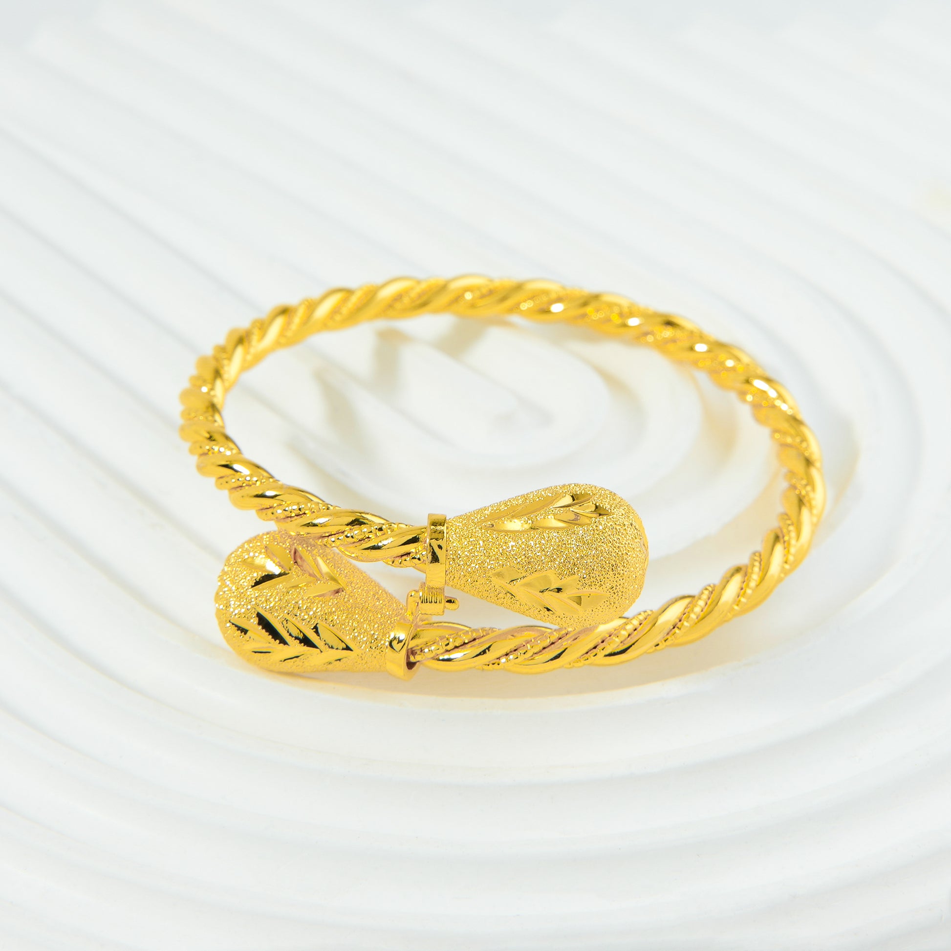 هذا الوصف يشير إلى إسوارة بانجل (Bangle) صلبة، تجمع بين ثلاثة تقنيات صياغة رئيسية: السبلة (السنبلة)، التجديل (الضفر)، و الرش الرملي (Matte Finish).