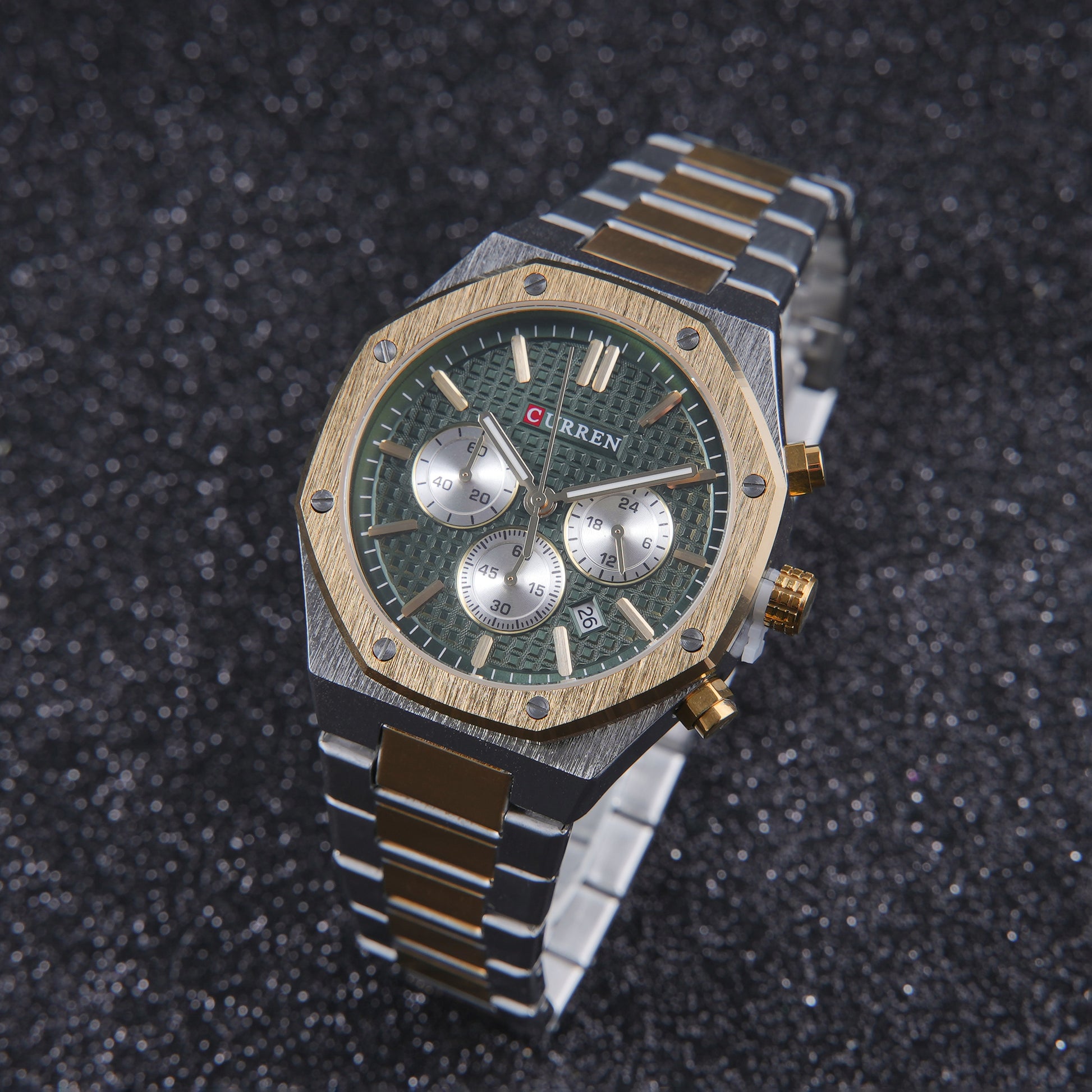 تتميز هذه الساعة من Curren بلمسة لونية فريدة من الميناء الأخضر العميق (Forest Green)، والذي يتناغم ببراعة مع الإطار والسوار المعدني (الفضي أو الذهبي). هذا المزيج العصري والكلاسيكي يمنح الساعة مظهراً لافتاً يعكس الذوق الجريء والاهتمام بالتفاصيل، مما يجعلها مثالية لإضافة حيوية وفخامة إلى ملابسك اليومية.