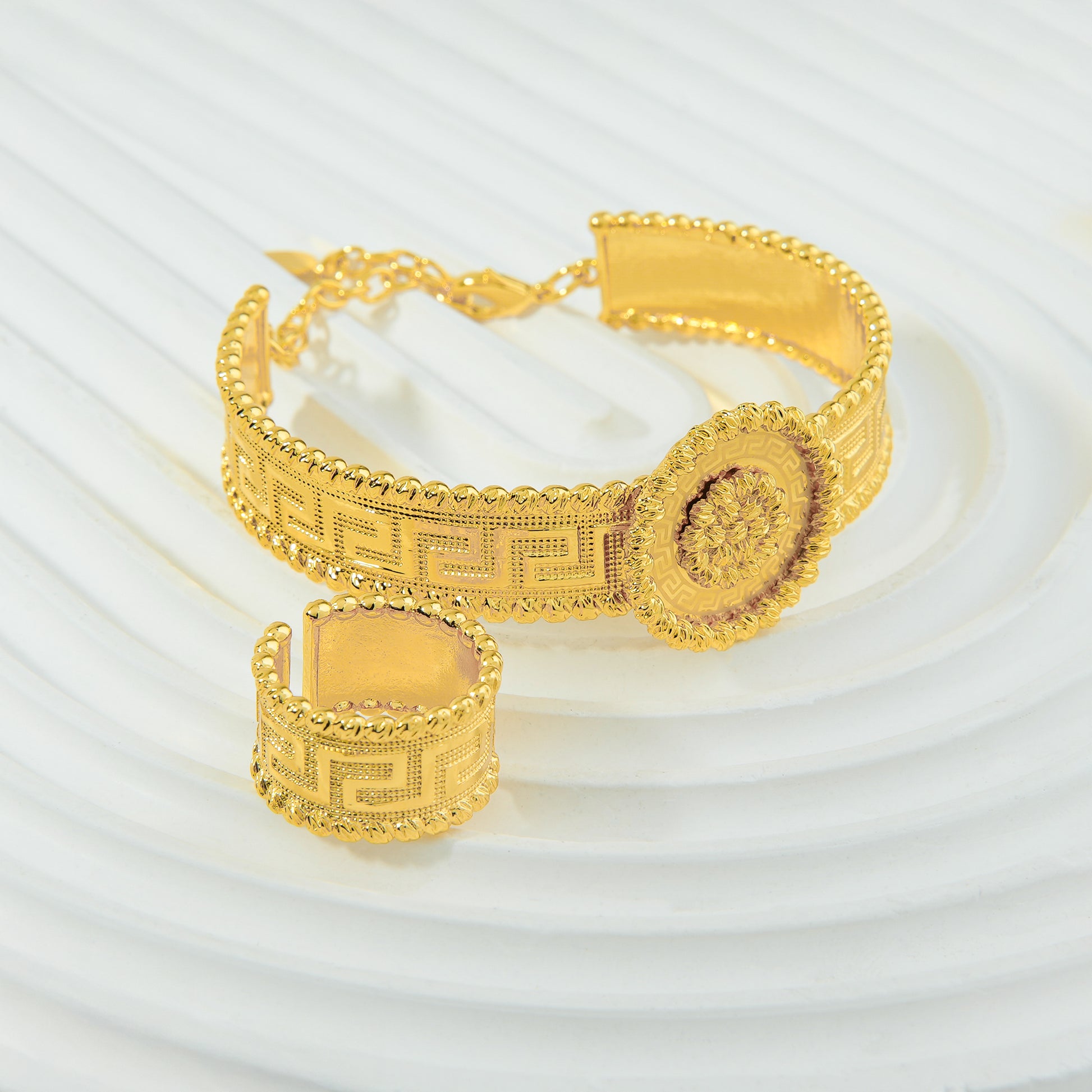 إنها قطعة فنية ضخمة، تُعرف بـعرضها وسمكها الملكي، وهي مصممة ليلتف حول المعصم بثبات وفخامة. تُصاغ كـشريط ذهبي عريض، وتُحفر حوافها أو قاعدتها بنقوش "الغريكا" اليونانية المتقنة التي ترمز للتراث العريق. الإسوارة لا تُلبس، بل تُعلن عن نفسها كإكسسوار سيادي لا يمكن تجاهله.