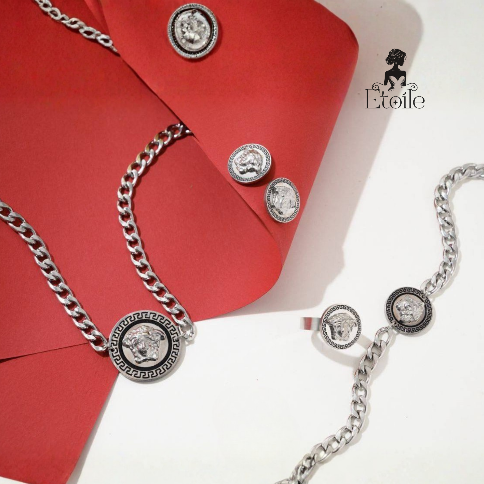 التصميم: متناسقة مع القلادة، تكون عادةً على شكل حلقات (Hoops) مزينة بنقش الميدوسا، أو مرصعة بأحجار كريستال / زركون (Cubic Zirconia) براقة.